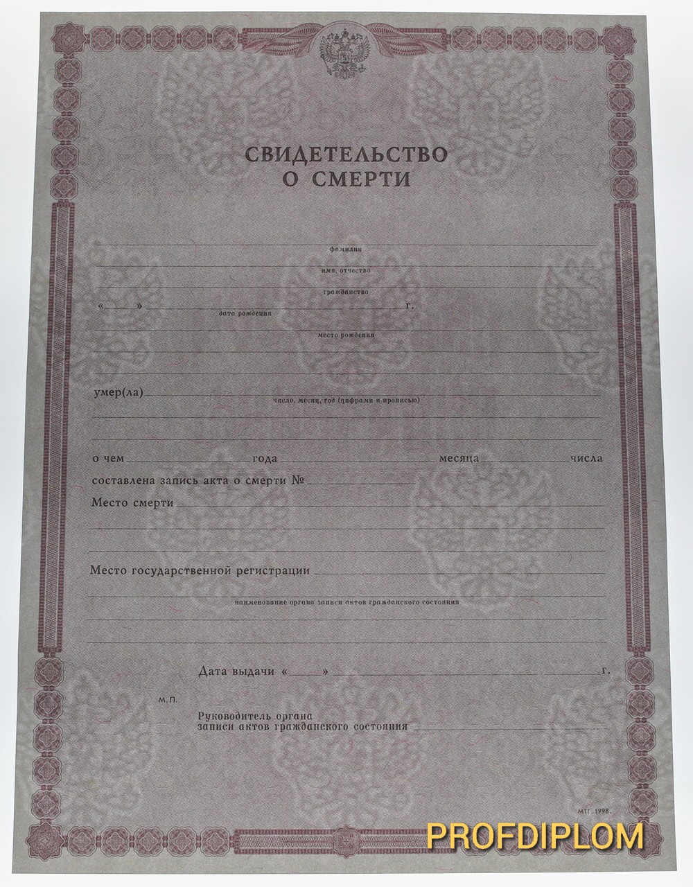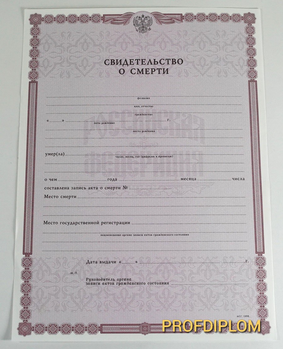 Перечень услуг, предоставляемых нашей компанией, не ограничивается изготовлением документов об образовании. Готовы предложить вам также свою помощь в выпуске различных свидетельств, в том числе – свидетельства о смерти. Отныне потеря такого важного документа не будет для вас чем-то невосполнимым, ведь мы изготовим для вас свидетельство на замену, аналогичное оригинальному. Все наши работы выполнены только на официальных бланках, в строгом соответствии со всеми правилами оформления подобных документов. Обращайтесь в нашу компанию – ваш заказ будет готов в кратчайшие сроки, недорого, но качественно!